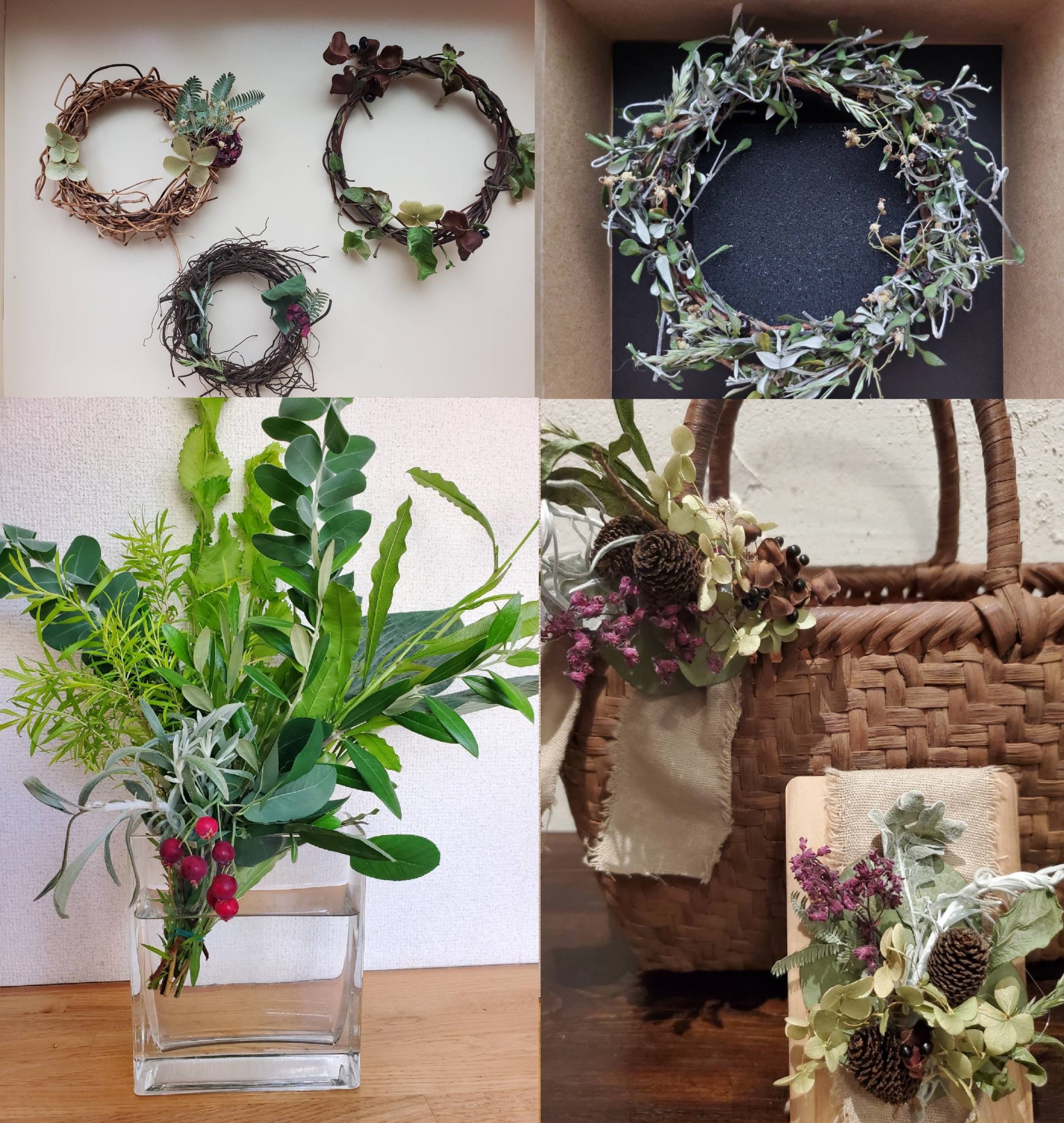 未分類初夏の葉ものを中心に、フェイジョアやジューンベリーなど季節の花や実が彩りを添える爽やかなリーフブーケをご用意します。植物のつるや根で作ったナチュラルリースや、実や花を使ったアクセサリーも販売いたします。